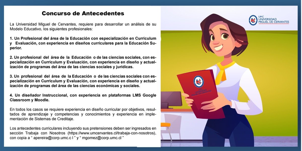 La Universidad Miguel de Cervantes está en la búsqueda permanente de profesionales que acorde a su misión, participen en la formación de excelencia de personas que contribuyan al desarrollo del país mediante una formación universitaria de calidad, integral y solidaria.POSTULA TUS ANTECEDENTES