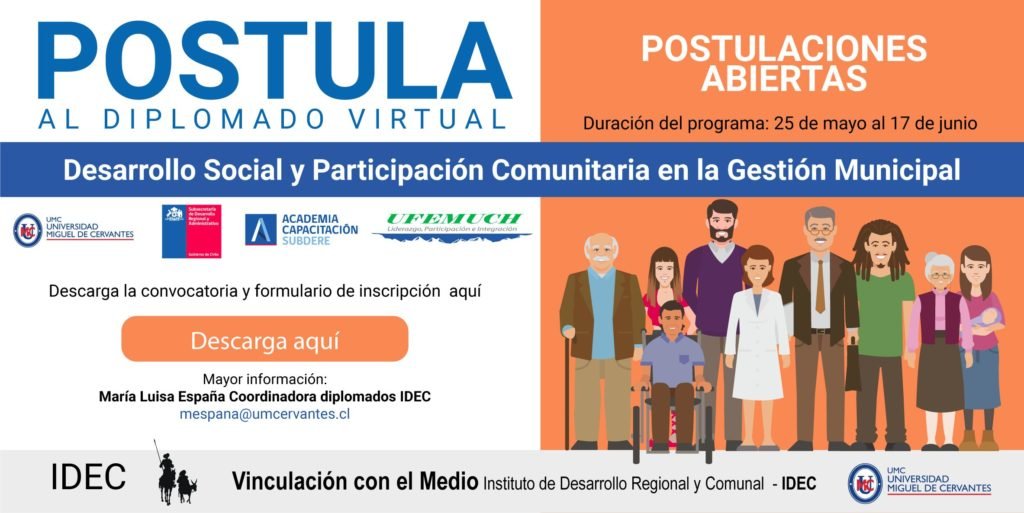 La Universidad Miguel de Cervantes, en el marco de los acontecimientos actuales que estamos viviendo como país y en el mundo, ha adecuado su formación presencial en diplomados orientados a la modernización de la gestión municipal, desarrollando una línea de diplomados virtuales en convenio con SUBDERE. Presentamos continuación “Diplomado en Desarrollo Social y Participación Comunitaria en la Gestión Municipal”.