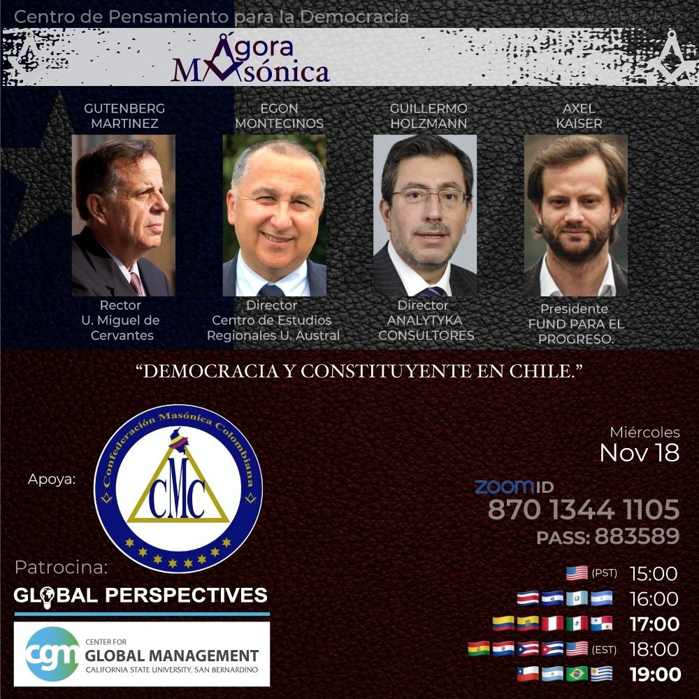 Invitado por el Centro de Pensamiento para la Democracia, el Rector Gutenberg Martínez participa junto a Egon Montecinos, Guillermo Holzmann y Axel Kaiser en el seminario Internacional “Democracia y Constituyente en Chile” a realizarse de manera virtual el 18 de noviembre a las 19:00 horas de Chile.