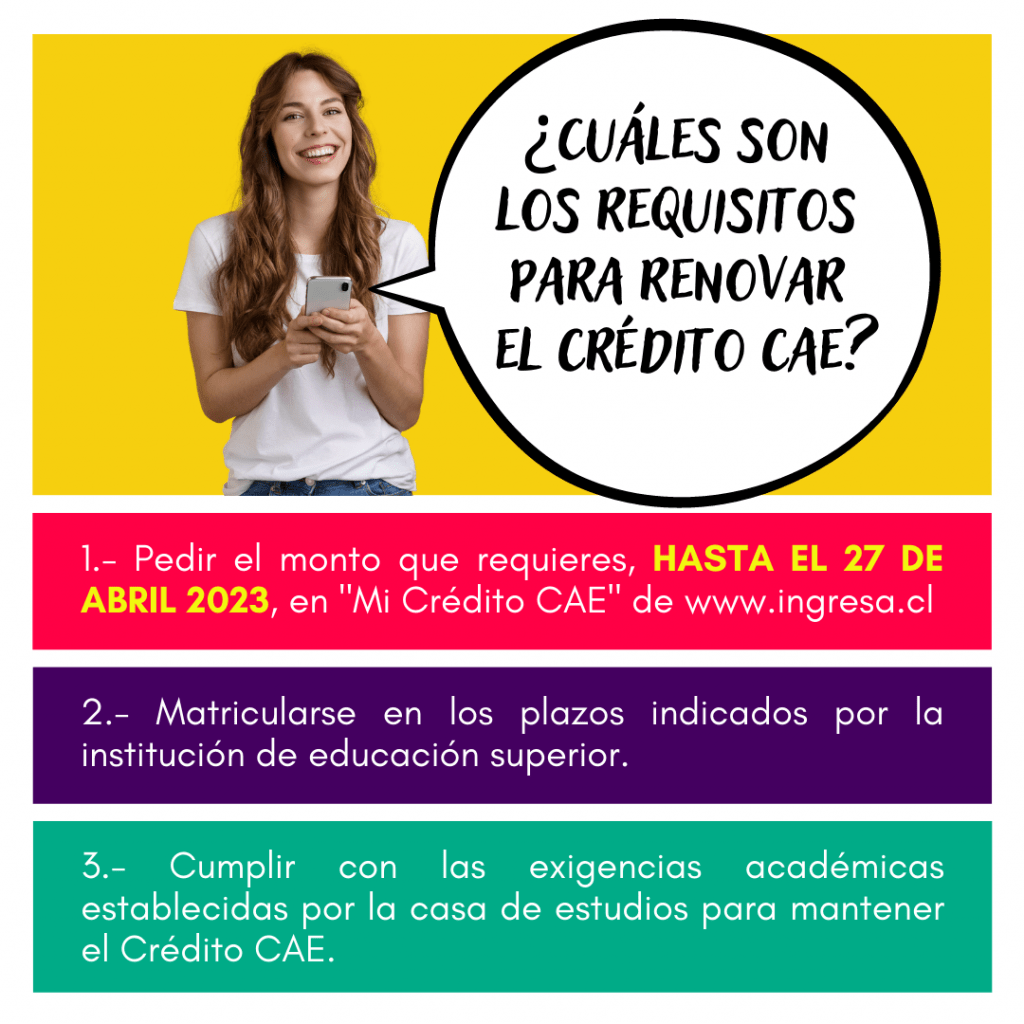 #RenuevaTuCAE DCVCM 3 años ago ATENCIÓN, BENEFICIARIO/A 2022 Y AÑOS ANTERIORES! Si necesitas renovar el Crédito CAE para tus estudios del año 2023, revisa las exigencias, en https://bit.ly/3UOhXSy #RenuevaTuCAE